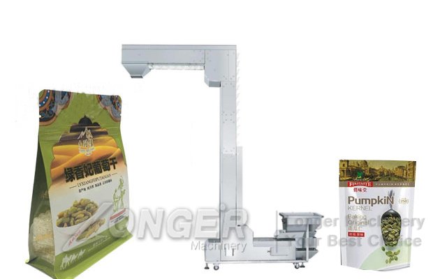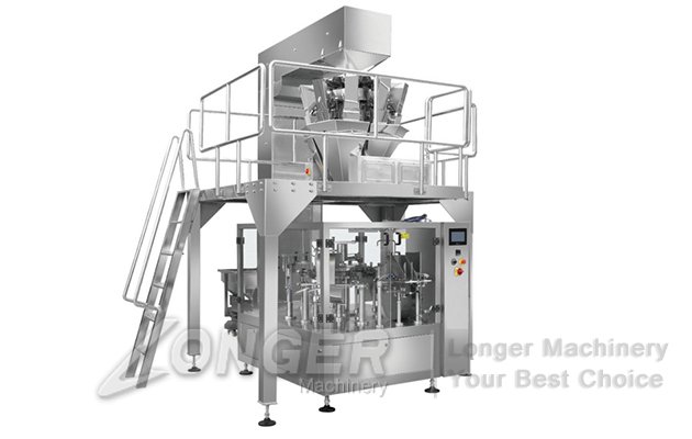 The automatic grain weighing packaging machine is suitable for automatic filling and packaging of solid materials such as grains, candy, nuts, dried fruits, raisins, peanuts, melon seeds, potato chips, chocolate, biscuits, etc.the machine composition:eight station rotary bag machine,10 1.6L electronic combination scal,Z-type material conveyor with vibration device,support platform.