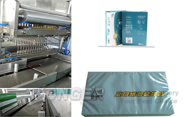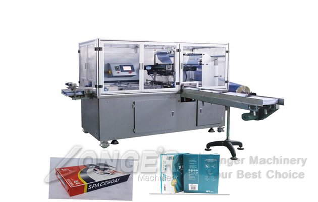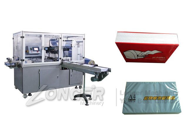 The A4 copy pape packing machine using material is cellophane and OPP Film, is common machine for different specification hard paper packing box, packing product, A4 copy paper etc. 3D packing. Transparent paper/film and a printed graphic or holographic laser mark folding line are bonded by adhesive, convenient for unpacking and anti-counterfeiting.