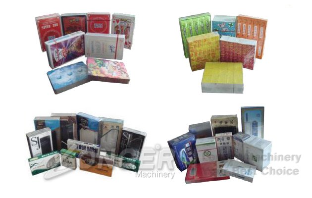 The single or combination box after the automatic parcels, heat sealing, counting and so on. Packaging speed can be adjusted, no box no film, through the replacement parts, can package different specifications of the items. like cigarette. Medicine, cosmetics, stationery, books, play card and other items of parcels.